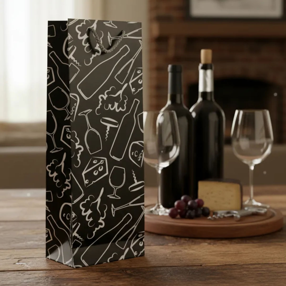 As Sacola para Garrafa de Vinho Detalhes Prateados unem elegância, resistência e apresentação sofisticada para qualquer ocasião. Produzidas em papel de alta gramatura, elas suportam perfeitamente garrafas de vinho, espumante e bebidas similares, oferecendo segurança no transporte e um visual premium.