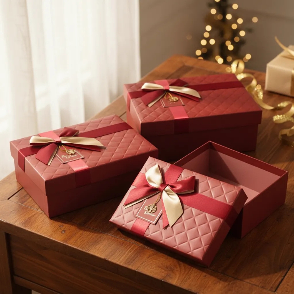 As Caixas para Presente de Luxo Retangular Com laço de cetim é a escolha ideal para presentear com elegância e sofisticação. Produzidas em material resistente e com acabamento premium, as caixas possuem estampa decorativa em tom vermelho queimado com detalhes dourados, laço de fita e tag metálica que traz um toque refinado e exclusivo.