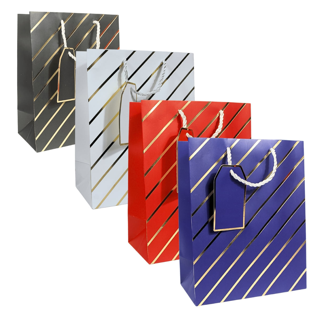Cada sacola é vendida individualmente e está disponível em 4 variações de cores, ideal para combinar com diferentes datas comemorativas e estilos de presente.
