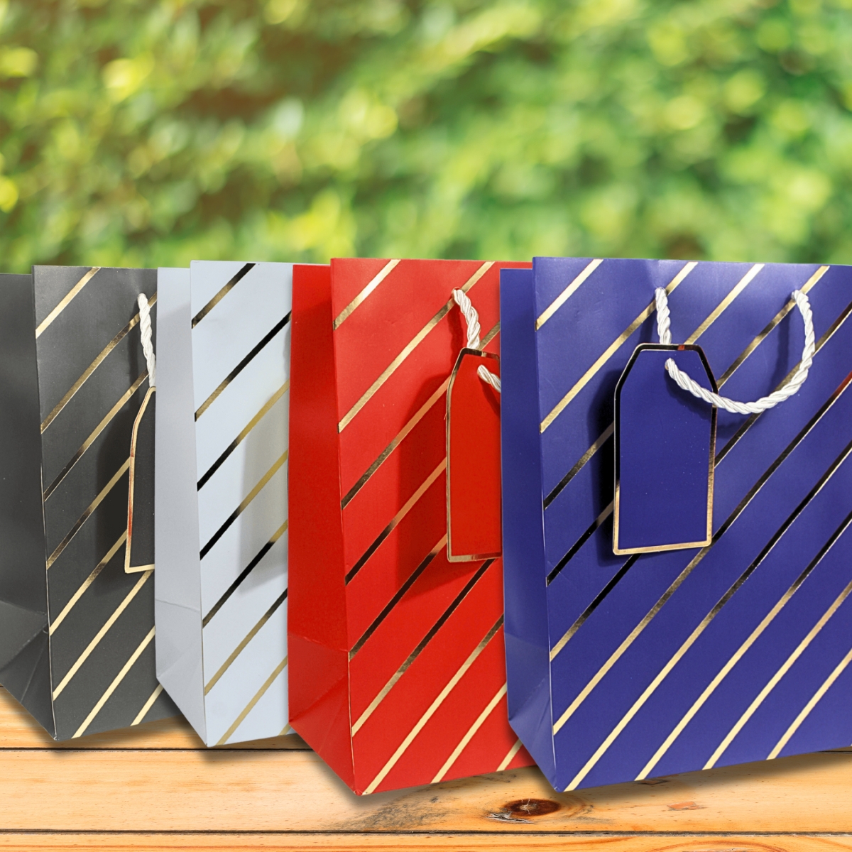 Cada sacola é vendida individualmente e está disponível em 4 variações de cores, ideal para combinar com diferentes datas comemorativas e estilos de presente