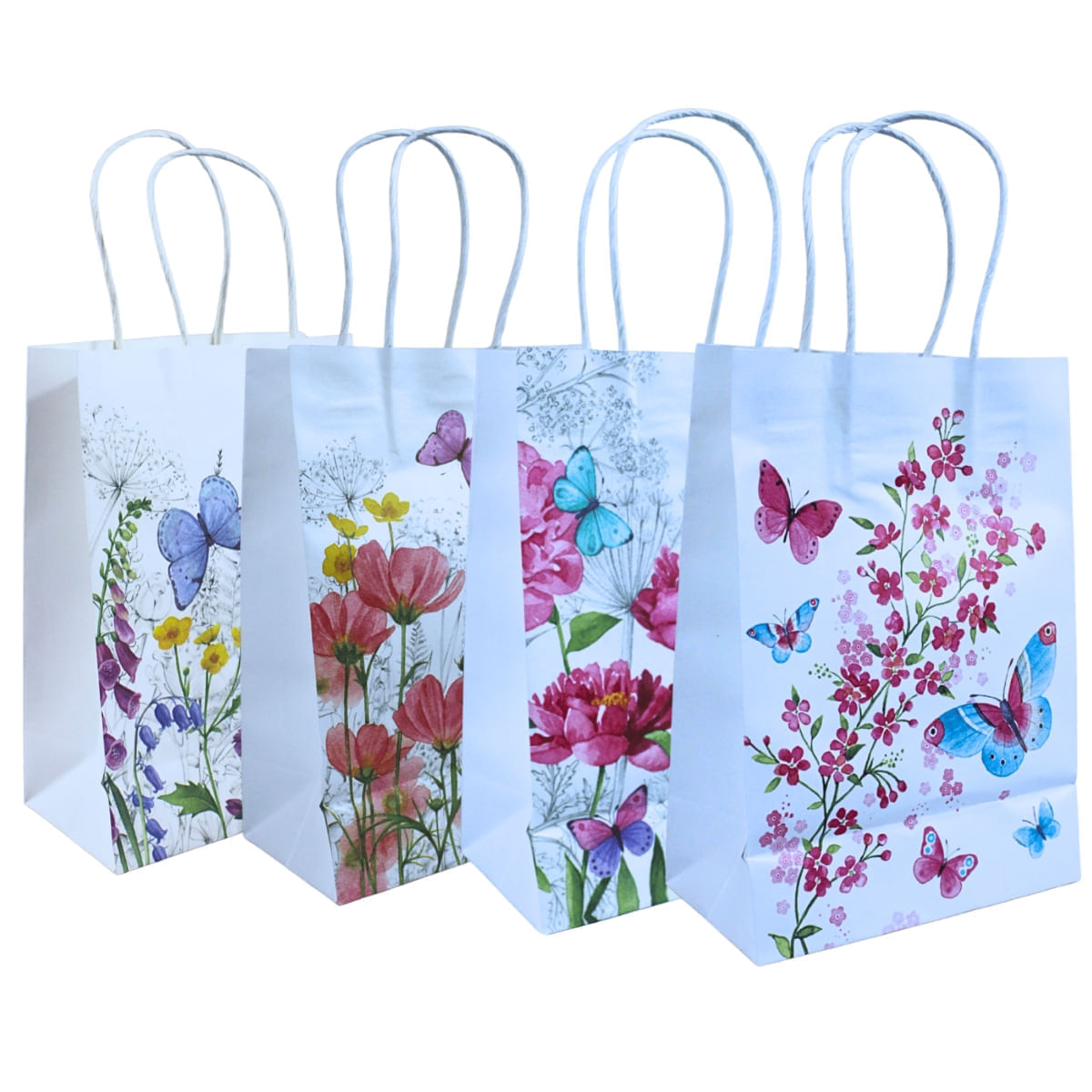 Deixe seus presentes ainda mais encantadores com este kit com 12 sacolas de papel, no delicado tema floral com borboletas. Cada sacola possui impressão vibrante, acabamento de qualidade e alça reforçada em cordão torcido, garantindo charme e resistência para diversas ocasiões.