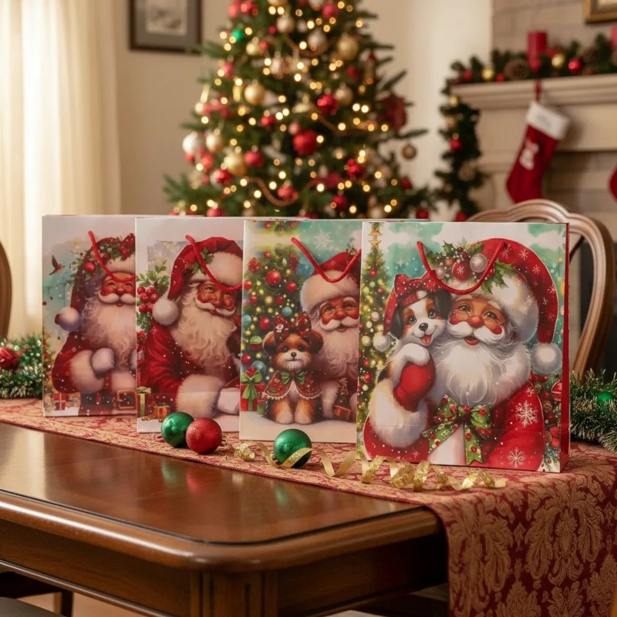 Deixe seus presentes ainda mais especiais com este Kit com 12 Sacolas de Papel Natalinas, cada uma com ilustrações vibrantes e encantadoras do Papai Noel e temas tradicionais de Natal. Com acabamento de qualidade, cores intensas e alças resistentes, elas são ideais para presentear amigos, clientes, familiares ou montar kits de vendas sazonais.