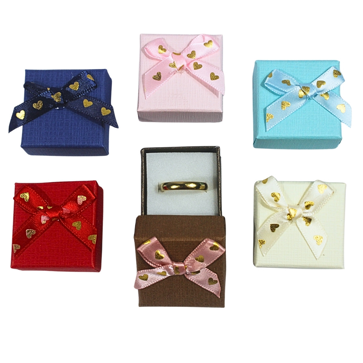 Encante seus clientes e valorize suas joias com este kit com 24 caixas para anel. Cada caixinha possui um design delicado, com laço de fita decorado com corações dourados, trazendo um toque de elegância e romantismo ideal para presentes especiais.