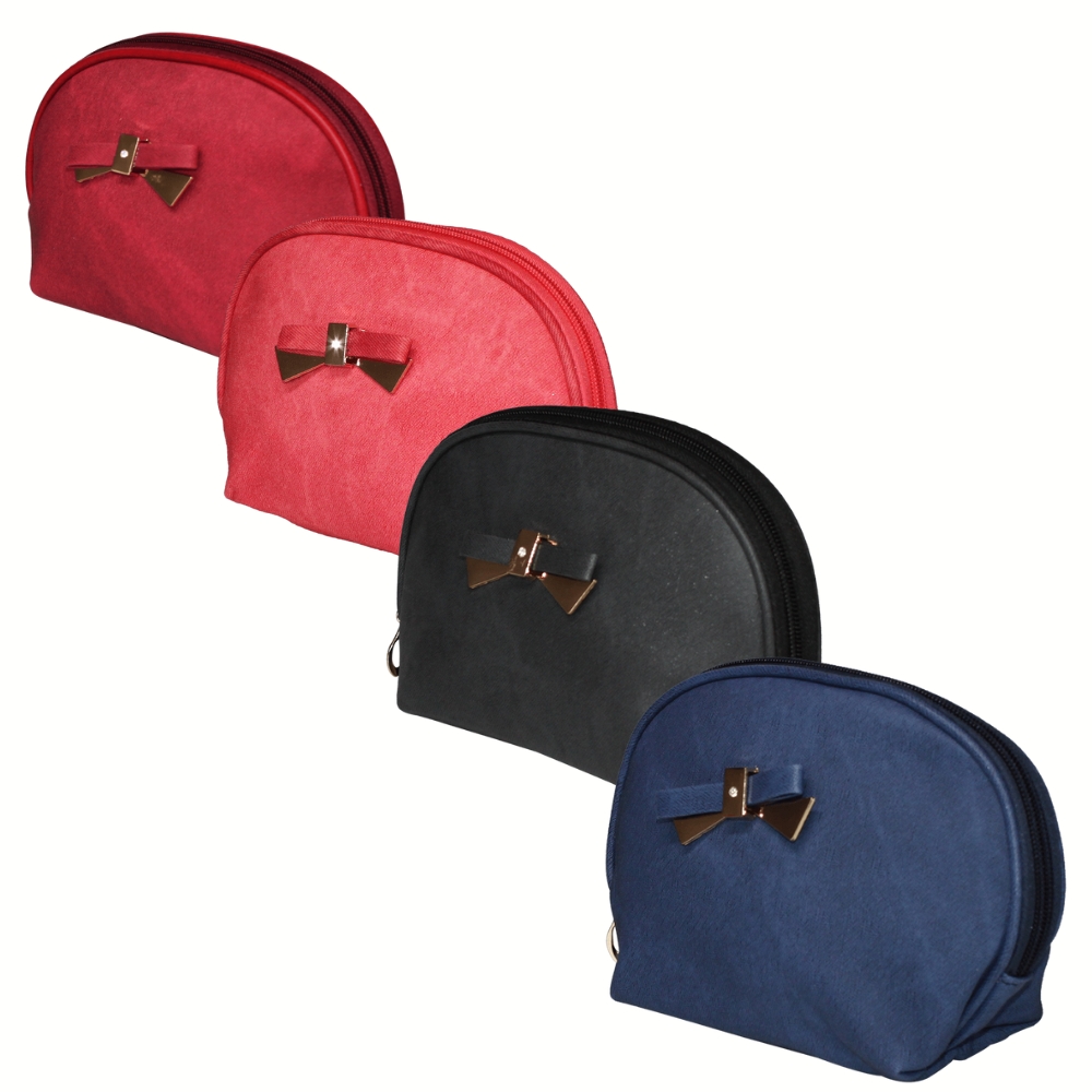 Necessaire feminina ideal para armazenar e carregar objetos pessoais. A necessaire tem composição interior de tecido e exterior em material sintético brilhoso, fechamento com zipper, pequeno espelho interno, e alça para transporte.